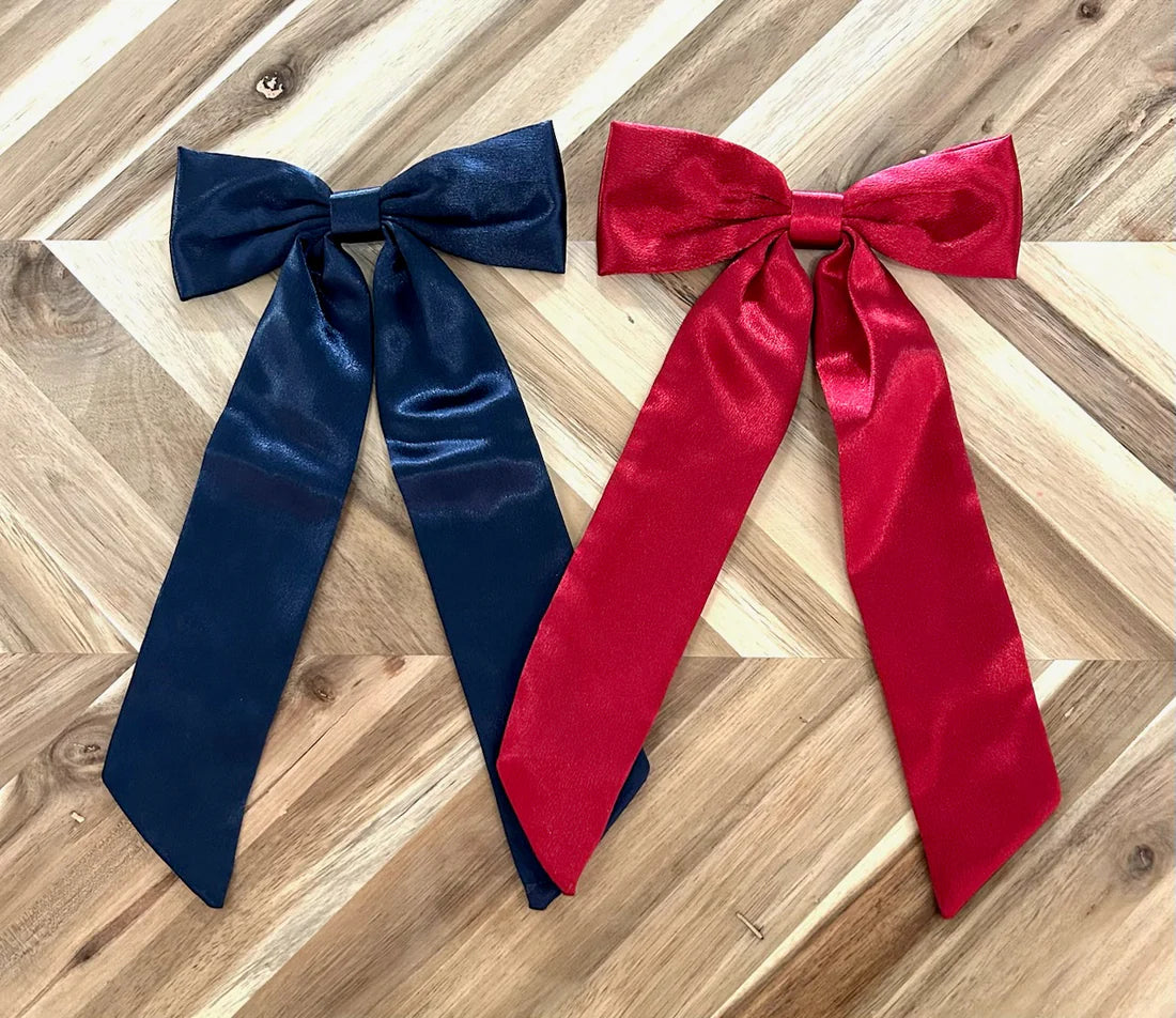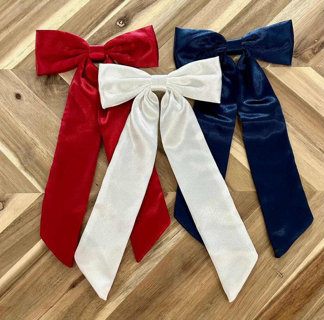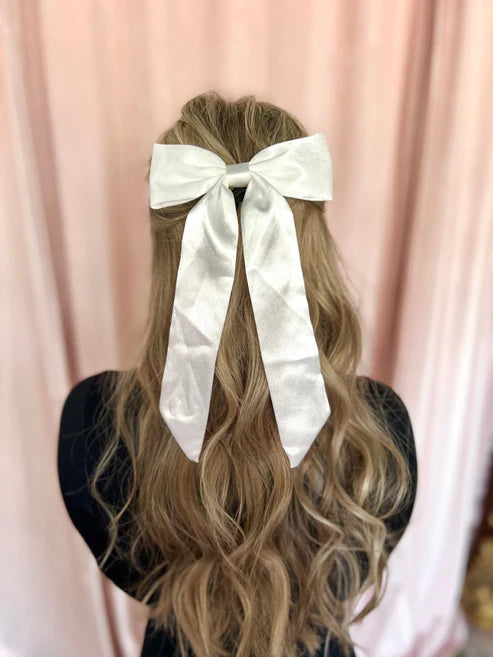 The latest must have accessory is here and we must say, we are living for a BOW moment!! These satin style bows are about 6 inch wide, and 10 inch long and are an alligator clip style closure!