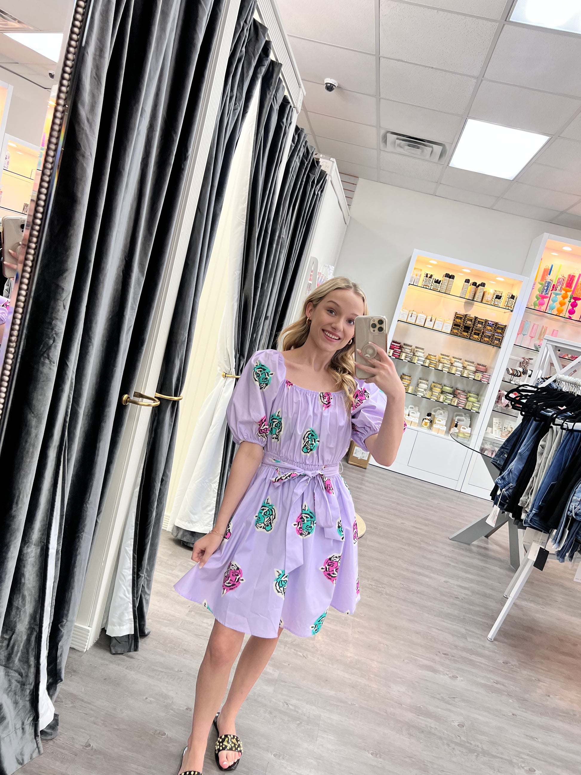 Lavender Short puff sleeves with Side Belt. with Magenta and Teal Tiger heads