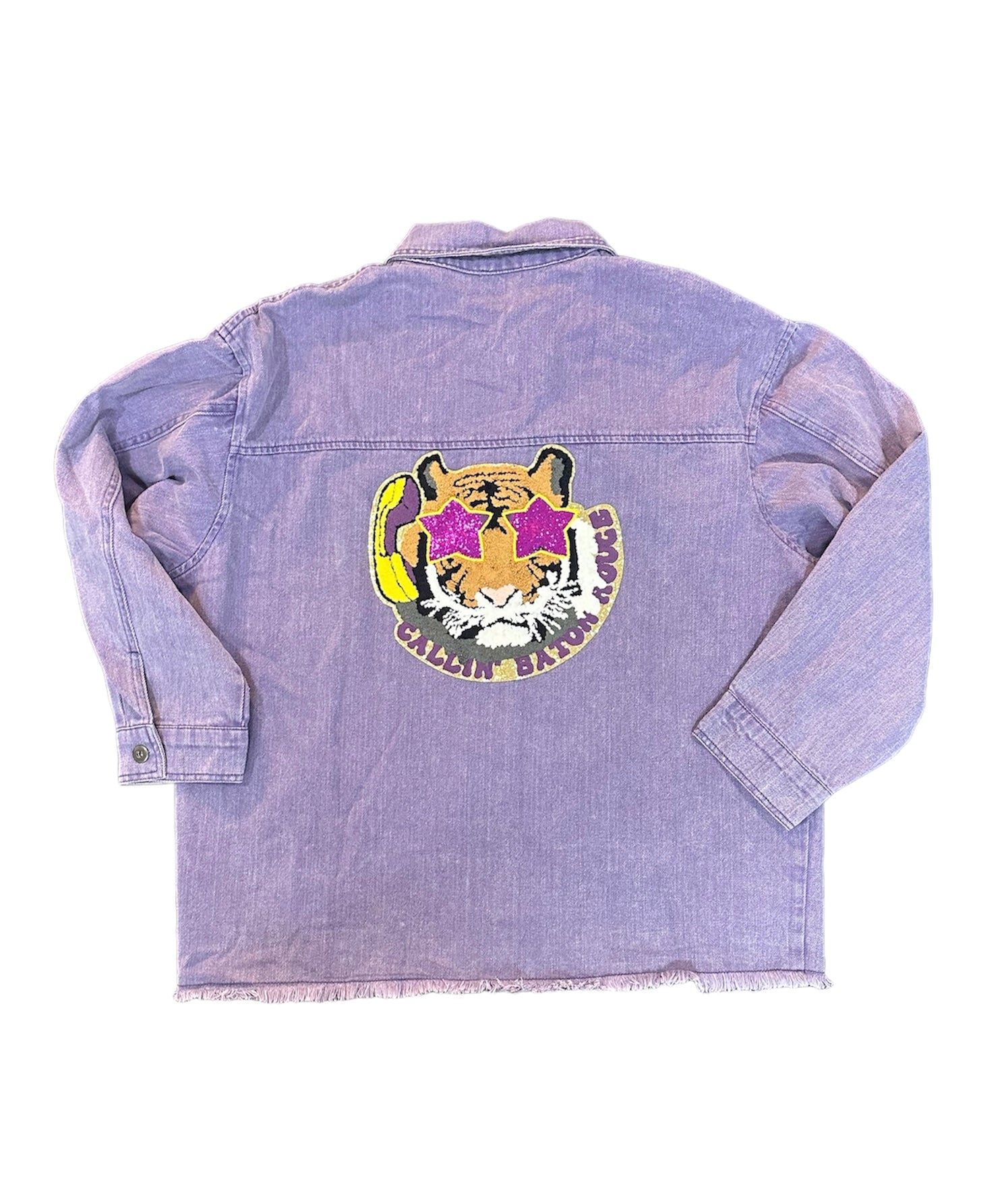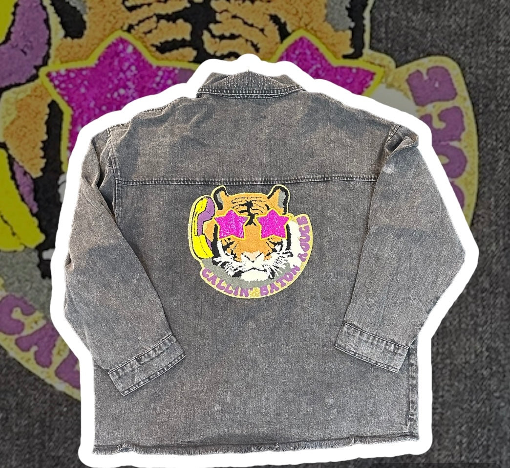 Washed denim jacket with chenille/glitter "Callin Baton Rouge" on the back
