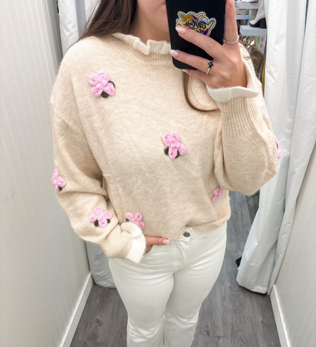 Cream based long sleeve sweater with physical pink flowers.