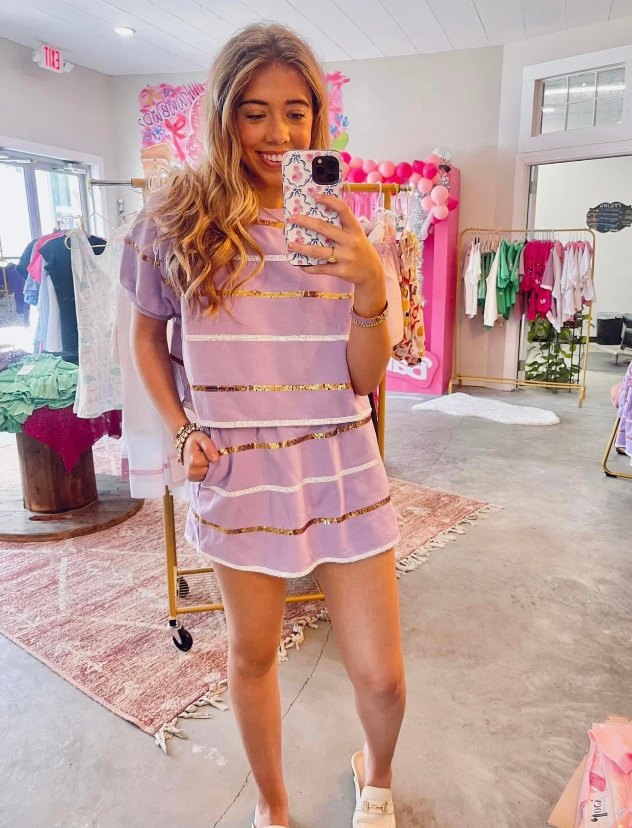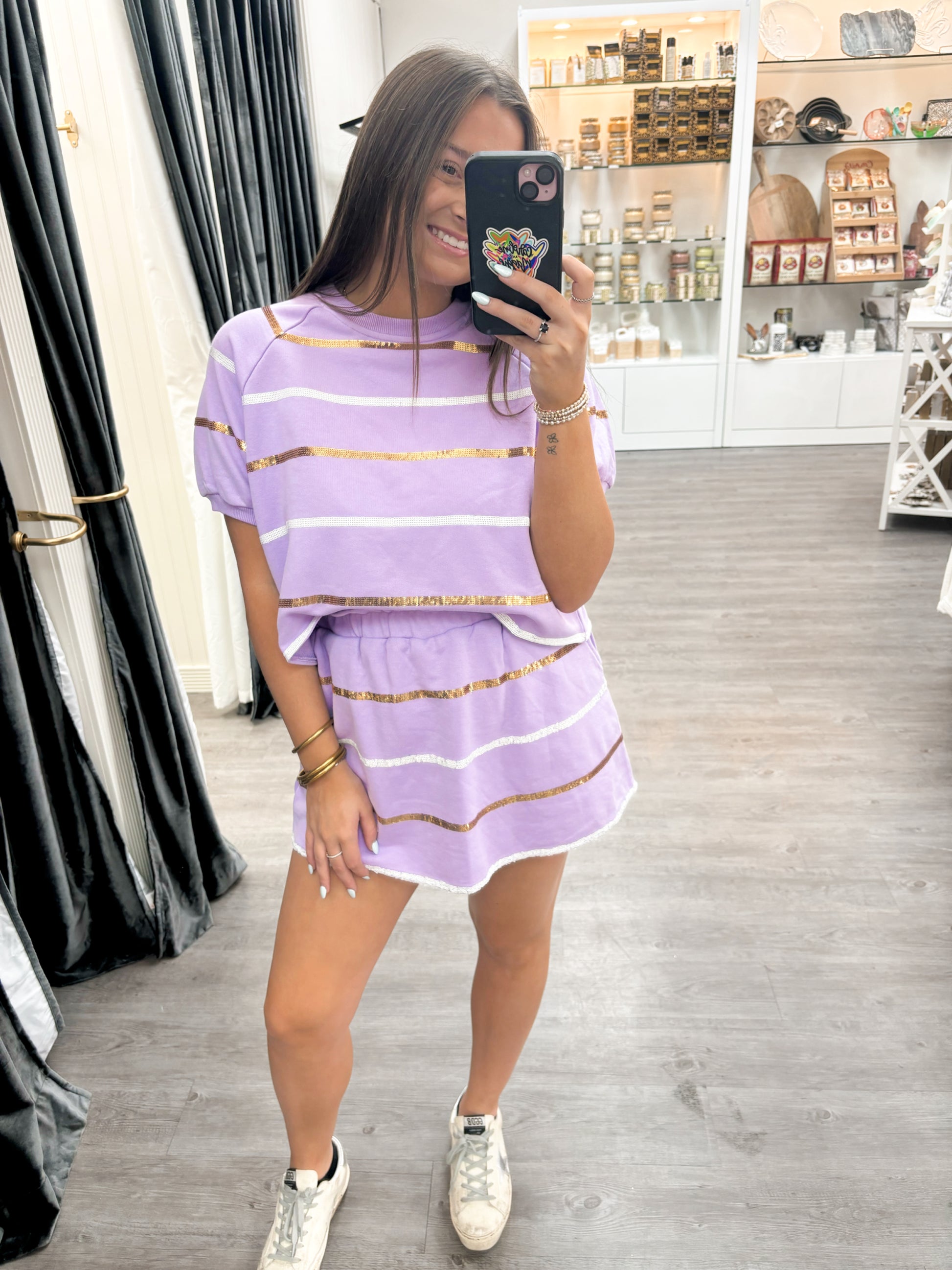 This light purple set with gold and white stripes is PERFECT! The skort has built in shorts to make it comfy all day.