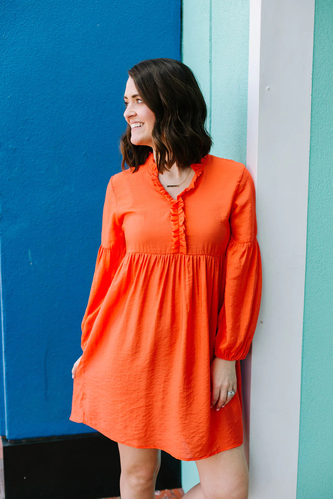 Long-sleeve dress with a flattering V-neckline and a ruffle embellishment.
