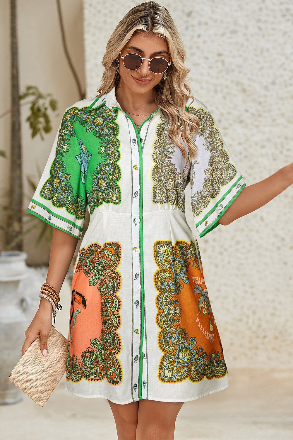 Embrace a fusion of ethnic prints and color blocking in this short dress, perfect for a casual yet stylish look. The short sleeves and collar add a touch of sophistication to this dress, making it versatile for both day and evening wear. Crafted in a breathable fabric, this dress offers comfort and style in one chic package, ideal for warm weather outings. The button-up front adds a trendy touch to the overall design, allowing for easy dressing and a customizable fit. Elevate your inventory with this trendy piece that caters to fashion-forward individuals.