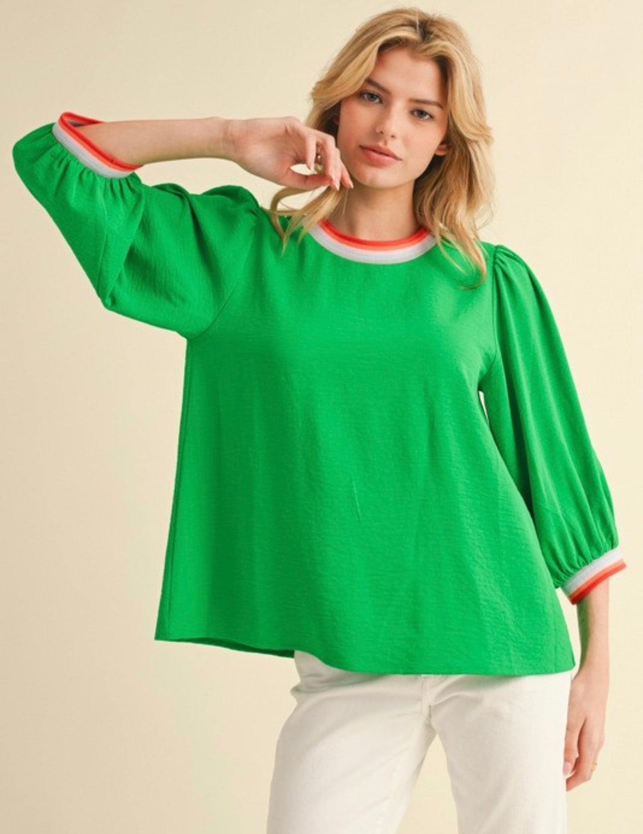 Flowy top with three quarter length sleeve. The cuffs and collar are bright and cheerful!