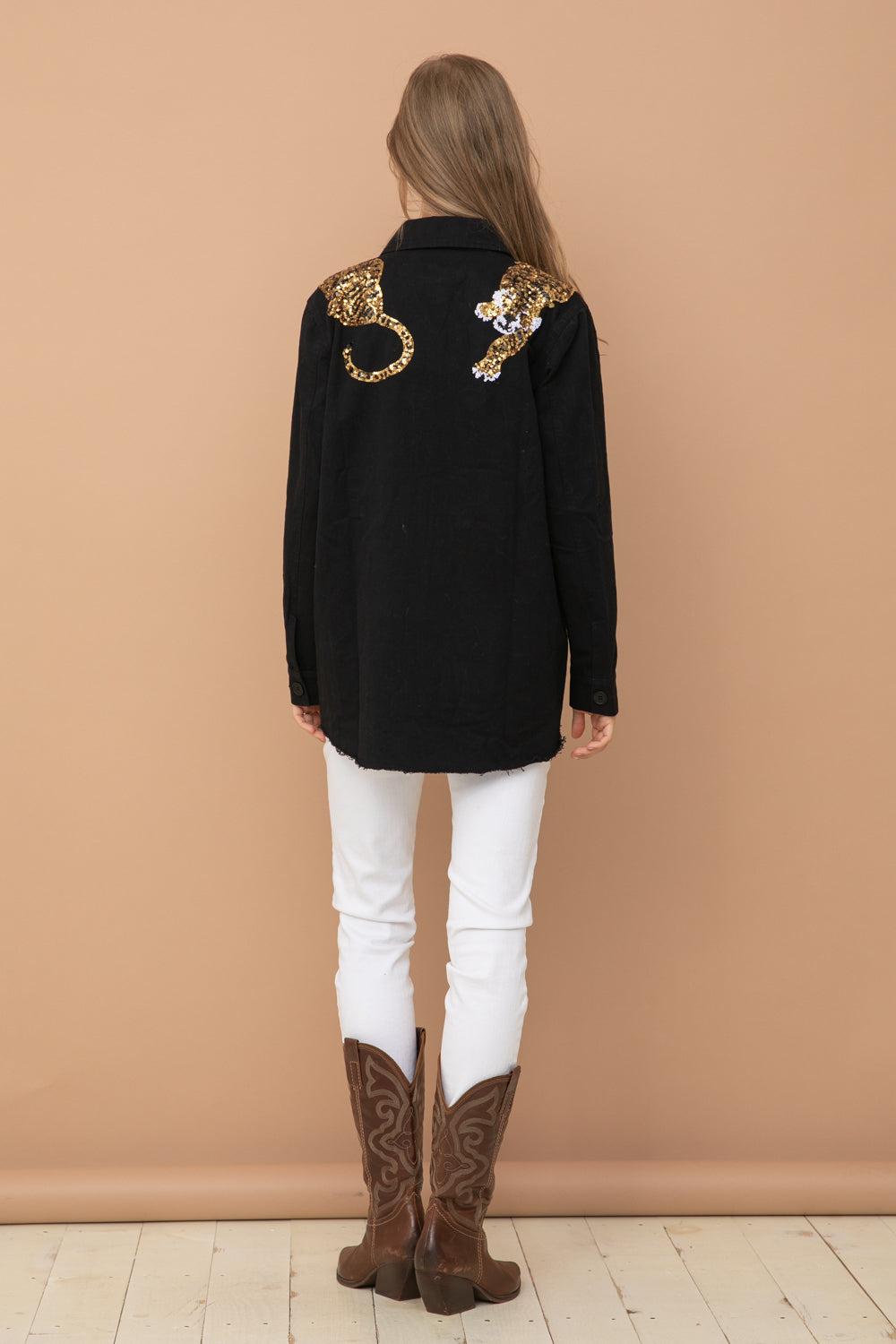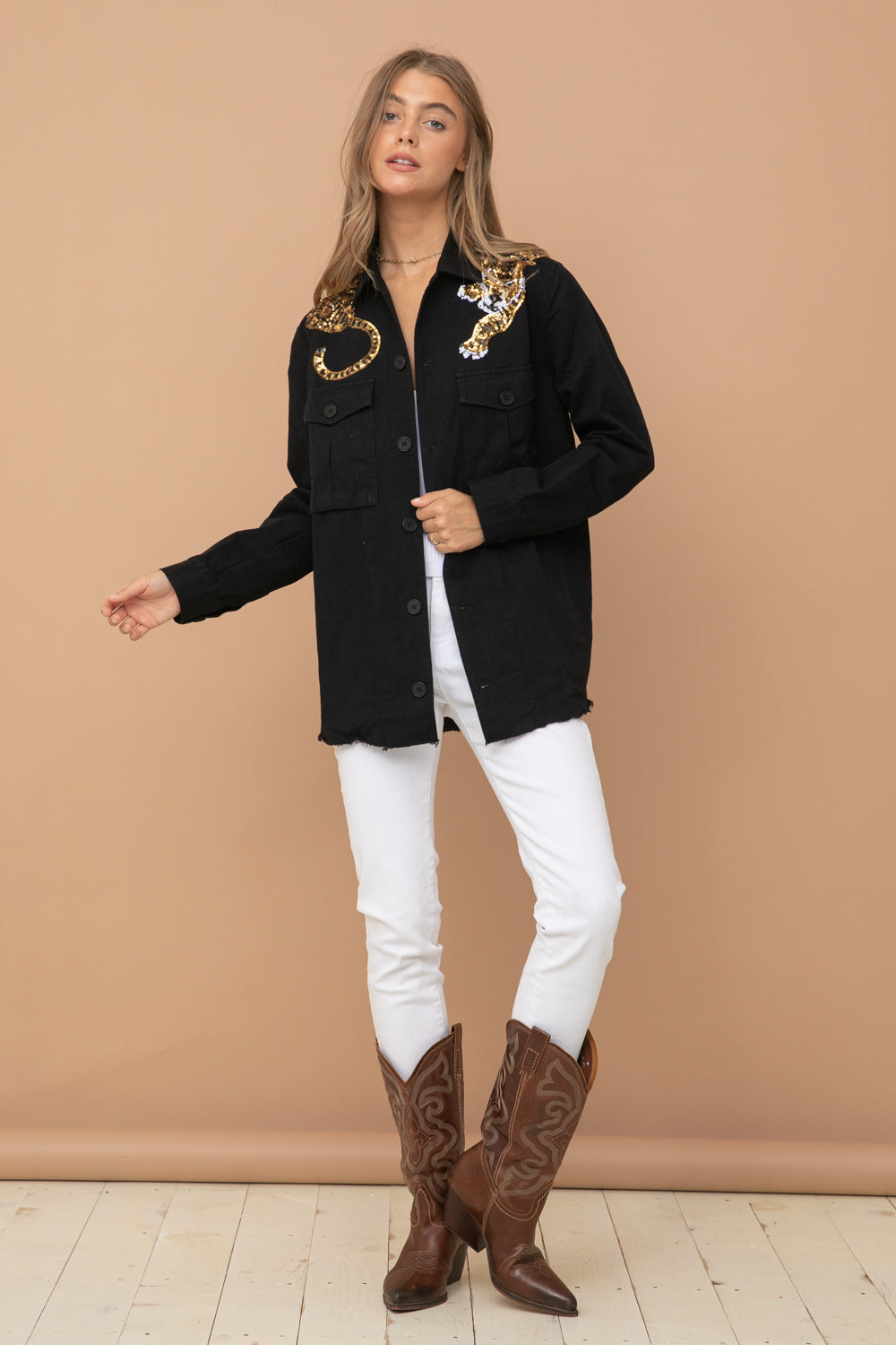 Cargo Style Jacket with Front Pockets. There is a Sequin Tiger over the shoulder.