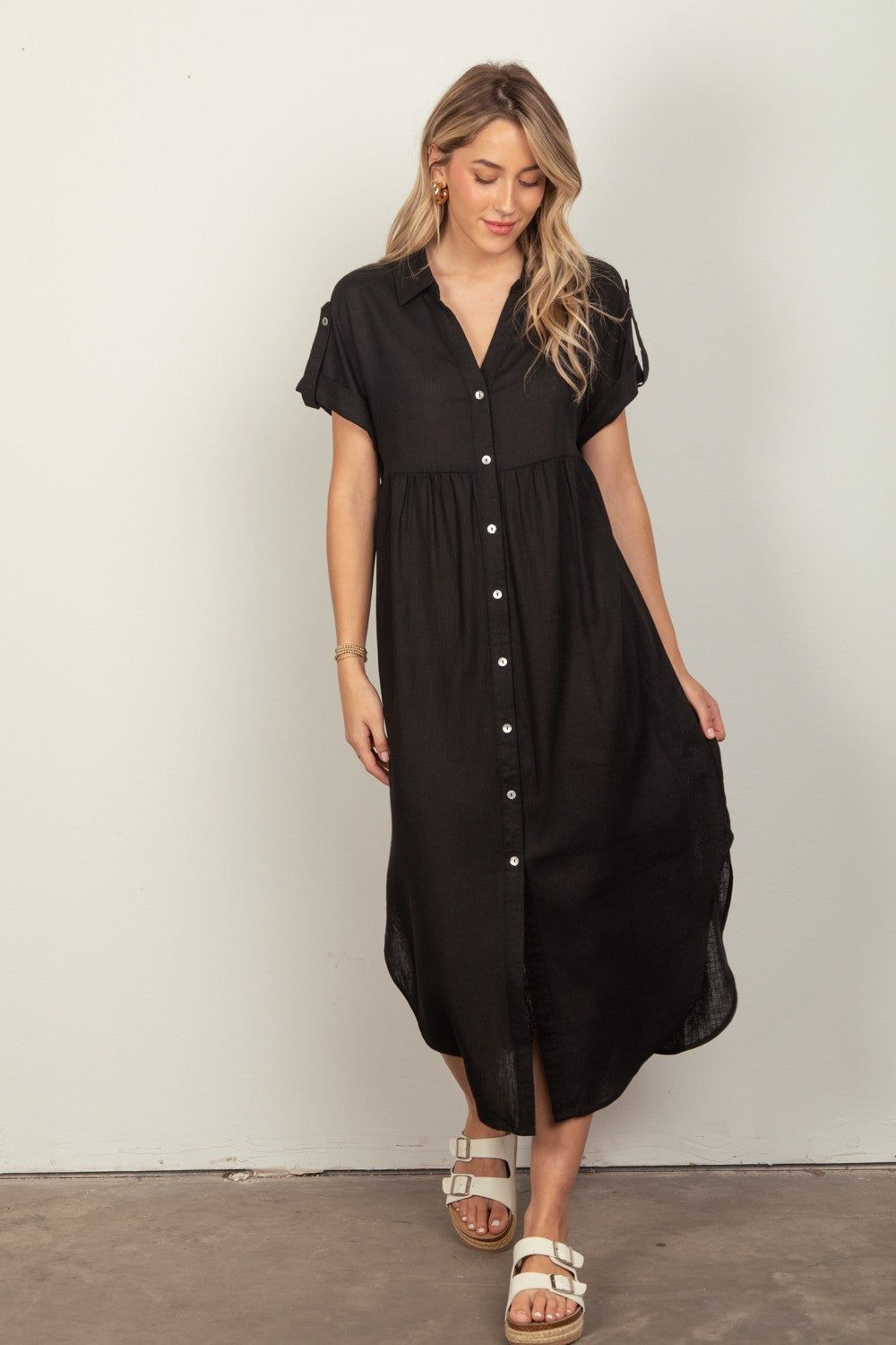 Oversized Solid Linen Woven Midi Dress - Drop Shoulder - Short Roll-Up Sleeve - Button Up - Maxi Dress - Round Hem - Sundress