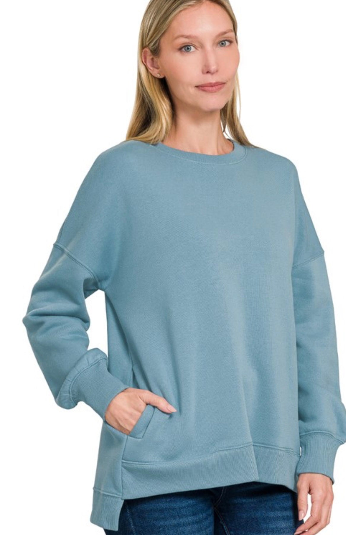 The perfect hi-low hem boyfriend sweatshirt WITH pockets! Throw this on with jeans or leggings for the perfect casual look.