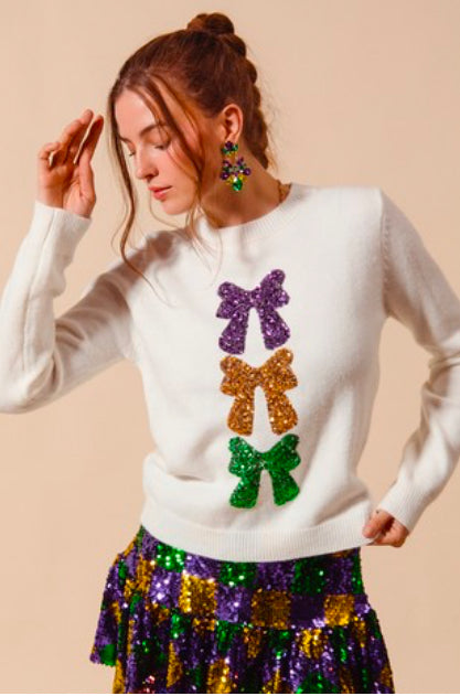 Mardi bows! The perfect Mardi Gras bows on a white sweater.