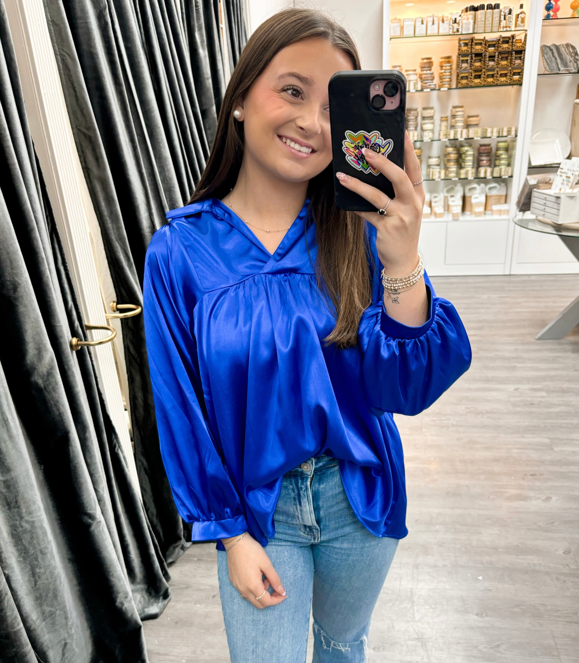 Adrienne Top. Royal blue color. Unique neckline and collar.