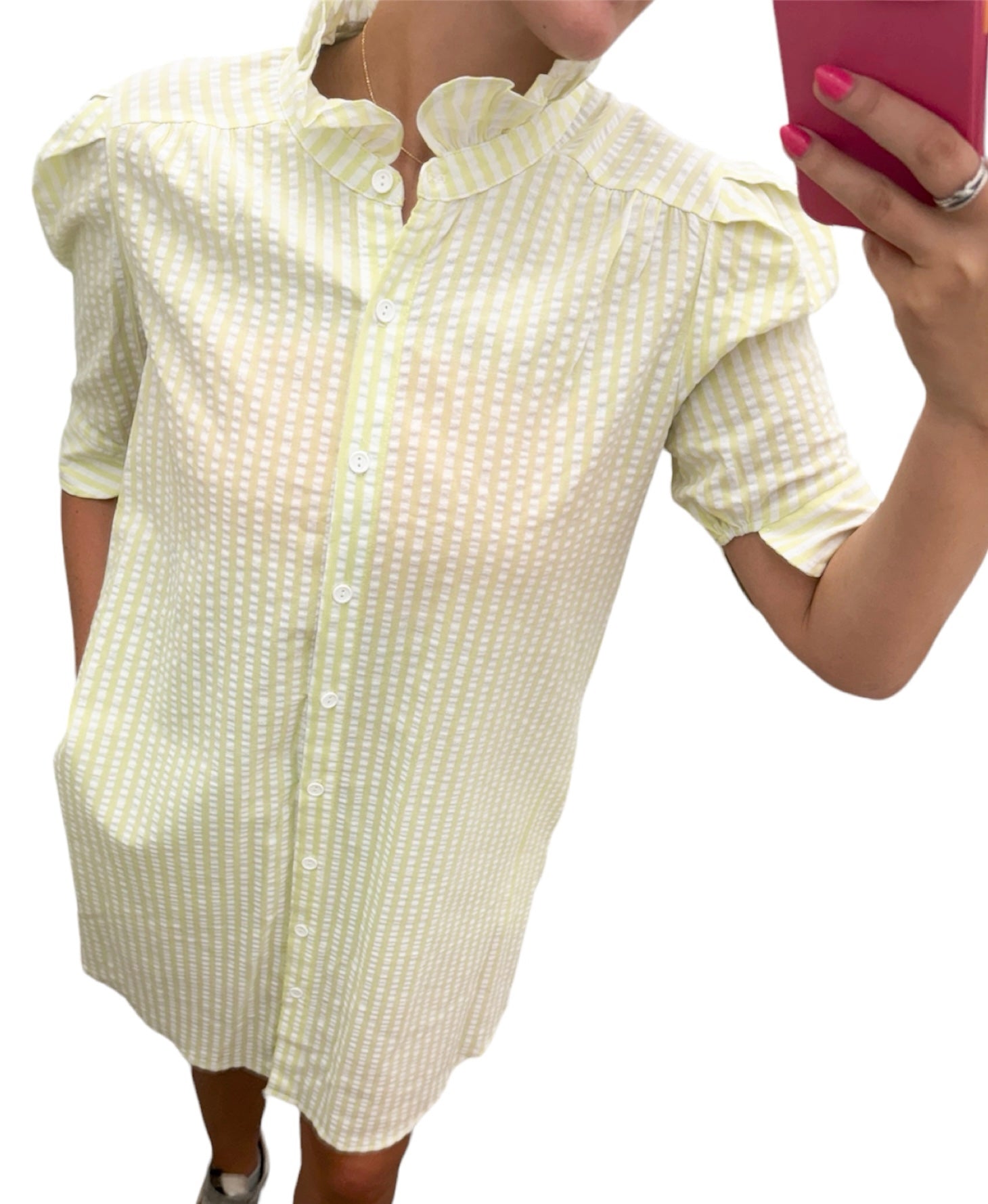 This dress checks all the boxes. Dress it up for a date night, wear it out shopping, or brunch with the girls. This lime seersucker is a showstopper. It a full button down with pockets and a high ruffle neck collar. The sleeve has a little elastic in the back to ensure a perfect fit.
