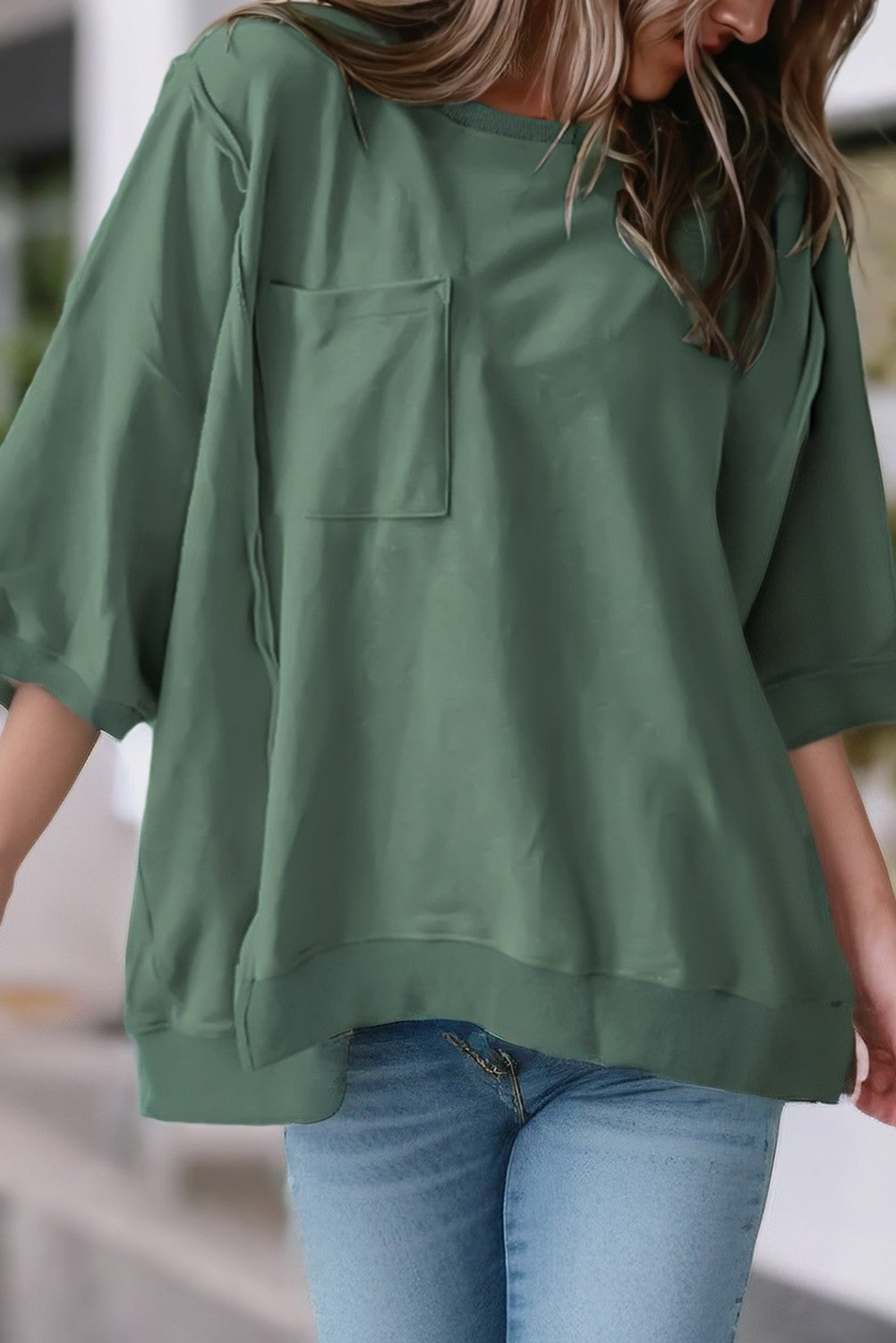This exposed seam top adds a touch of modernity and interest to your casual ensemble The side slits enhance breathability and create a stylish and modern silhouette Embrace a relaxed and comfortable style with the oversized fit. Stay organized and stylish with the practical chest pocket.