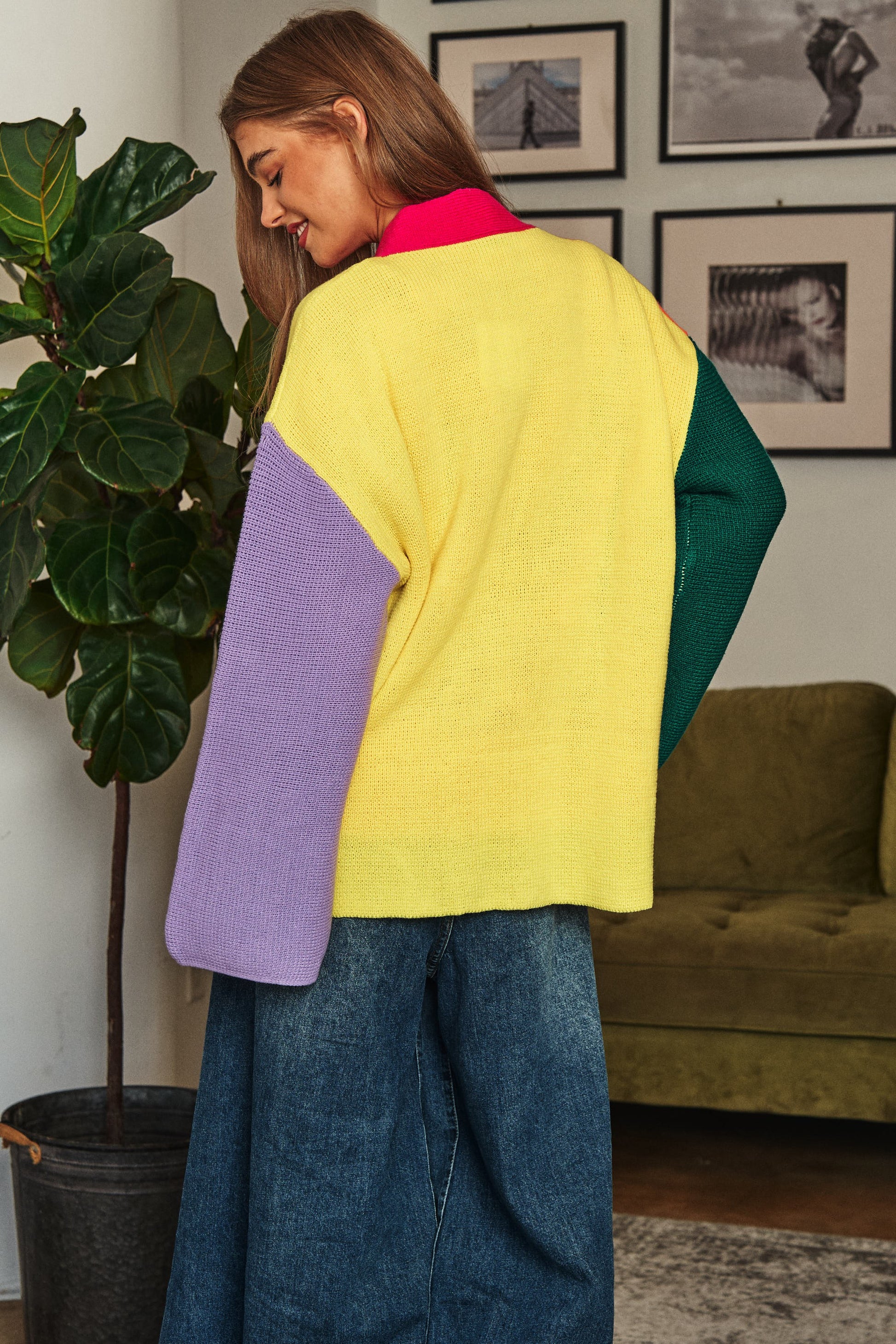 Mixed color block button front pockets loose fit knit sweater cardigan jacket.
