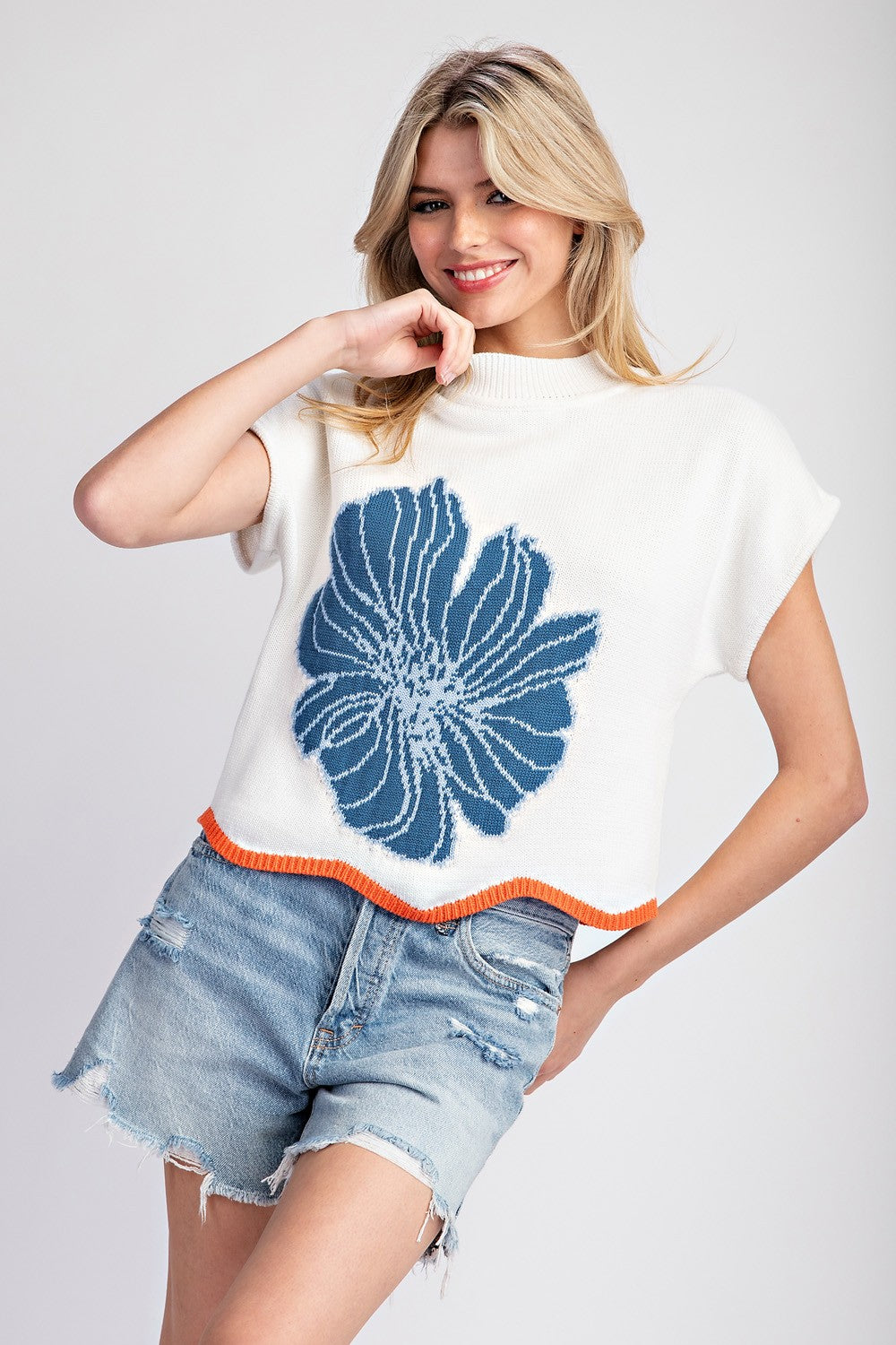 Short sleeve sweater with the perfect flower adding a pop of color.