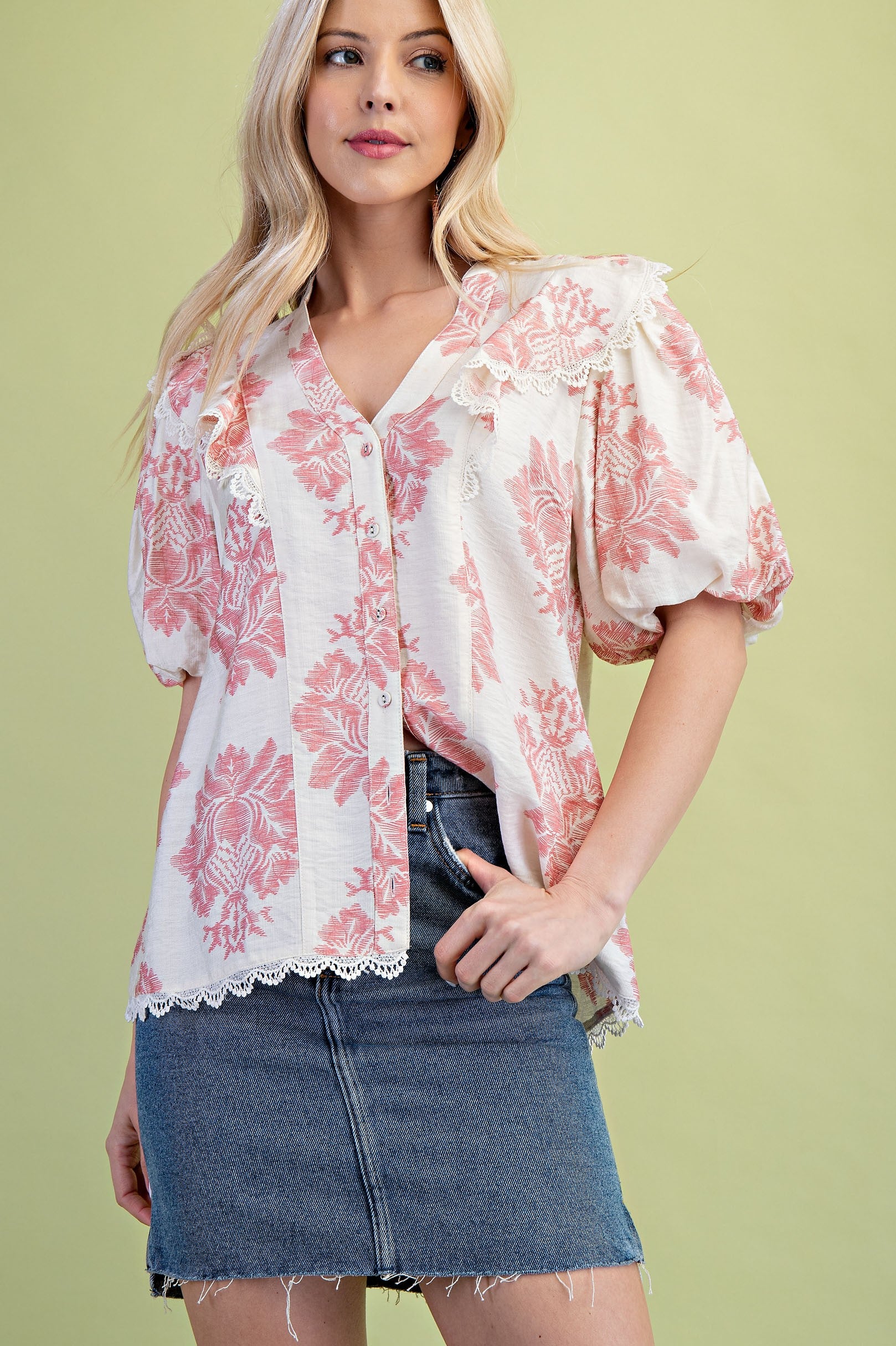 Floral Print Button Up Shirt with Lace Trimmed Ruffle Details