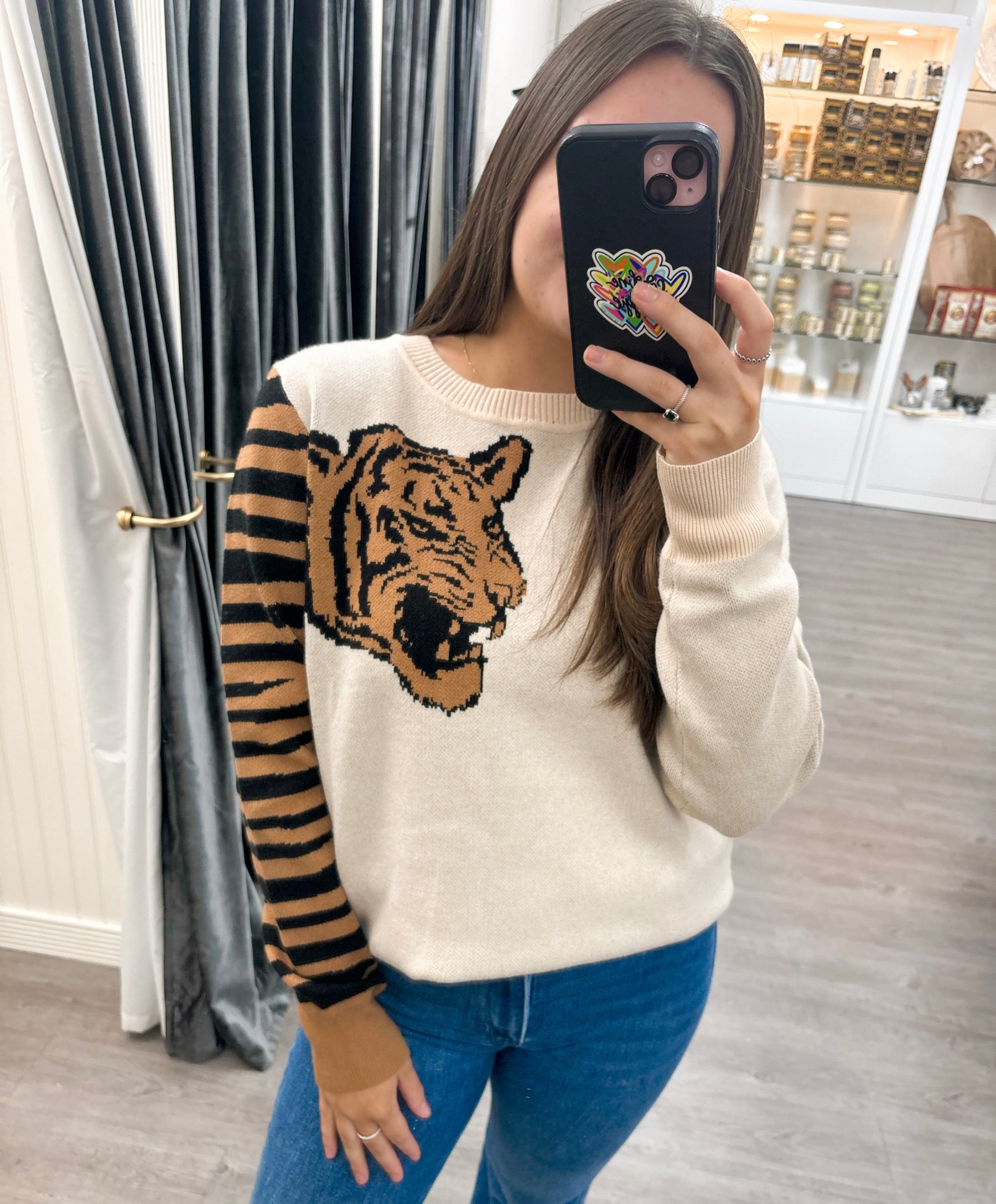 Tiger Pattern Long Sleeve Knitted Sweater.