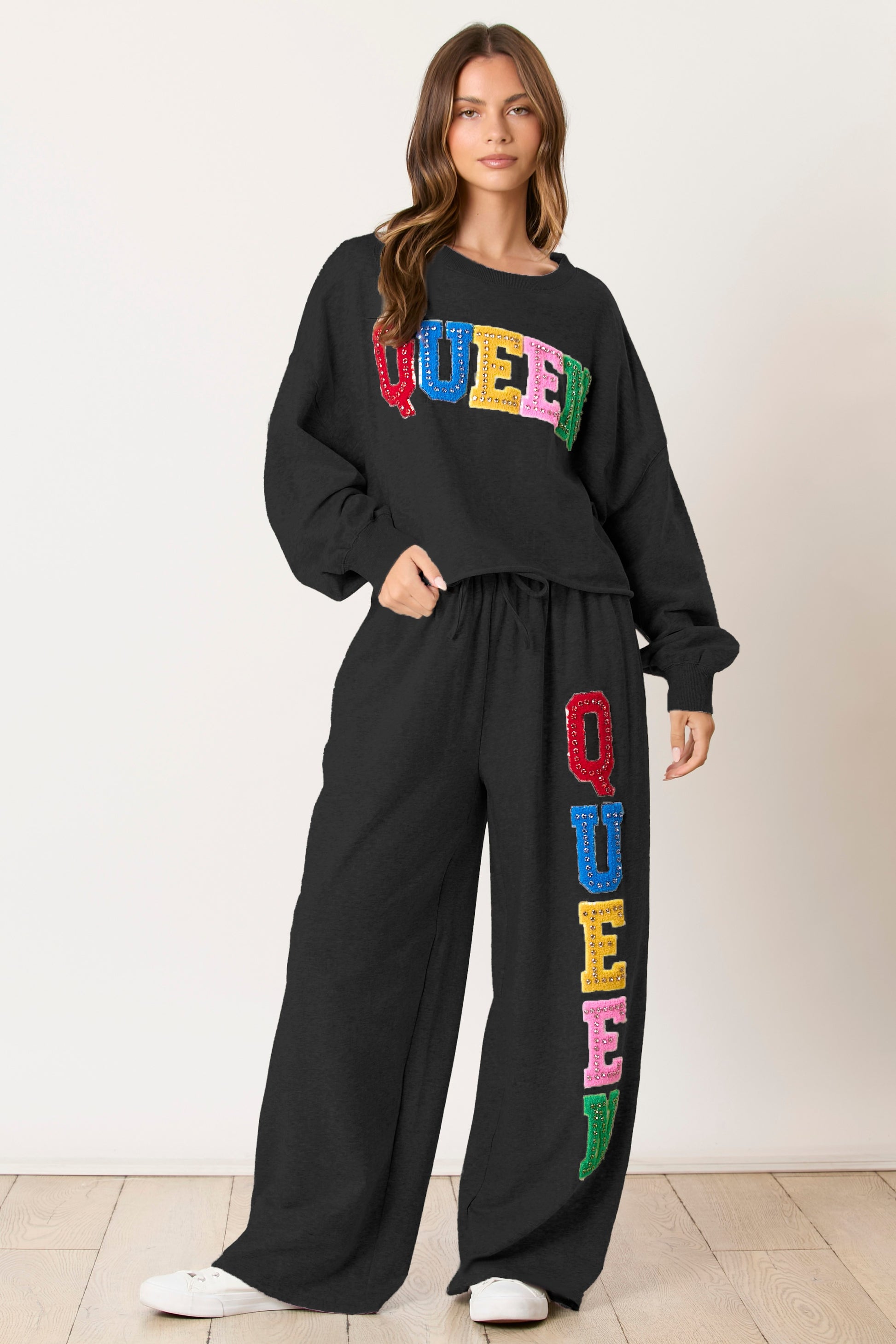 Queen Towel & Rhinestone Embroidery Sweatshirts - Long sleeves - Round neck - 'Queen' lettering sequin embroidery with towel and rhinestone embellishments -