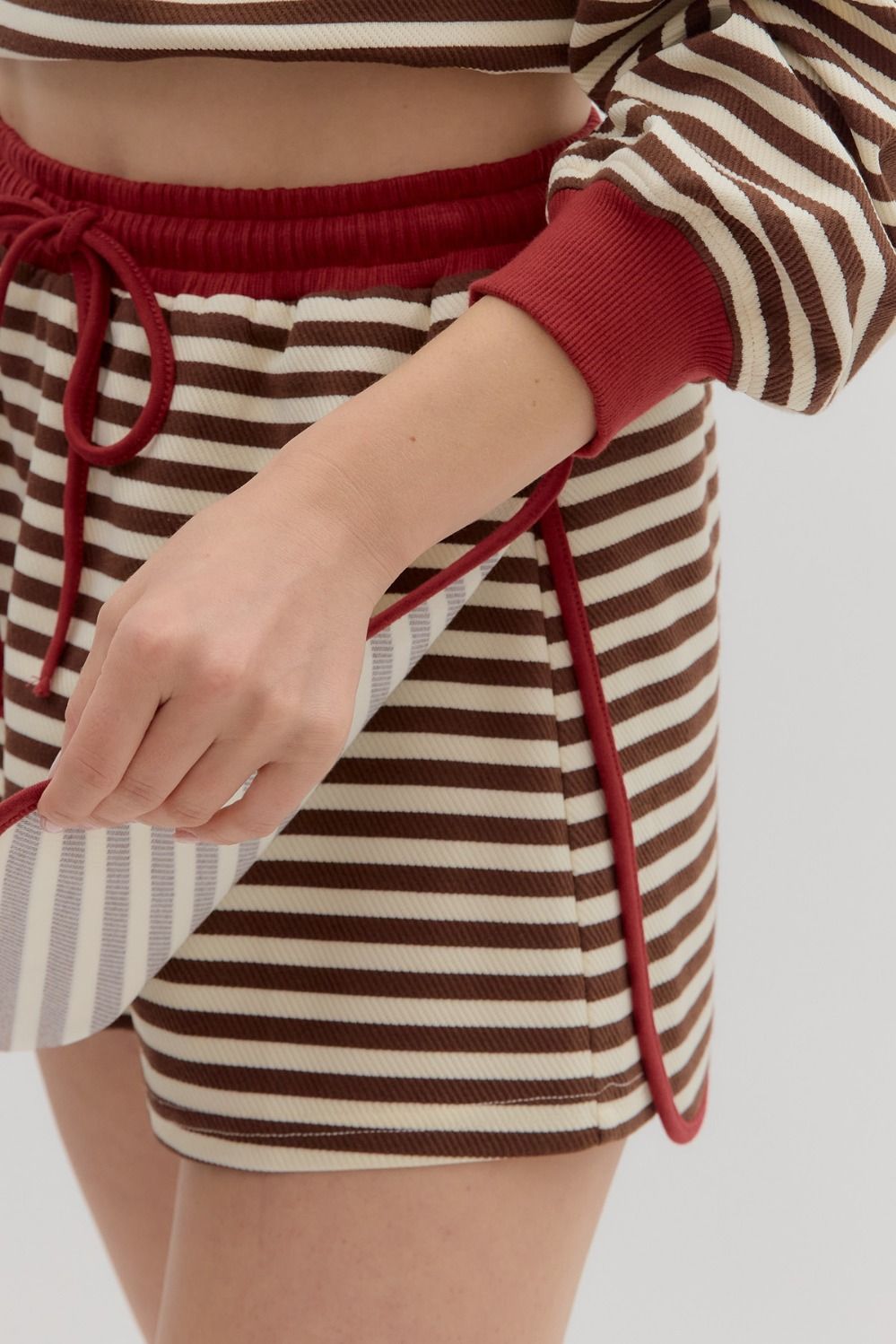 Stripe pattern jersey long sleeve pullover top featuring contrast accent band paired with s tripe pattern pull-on skirt lined with self shorts featuring drawstring elasticated waistband.