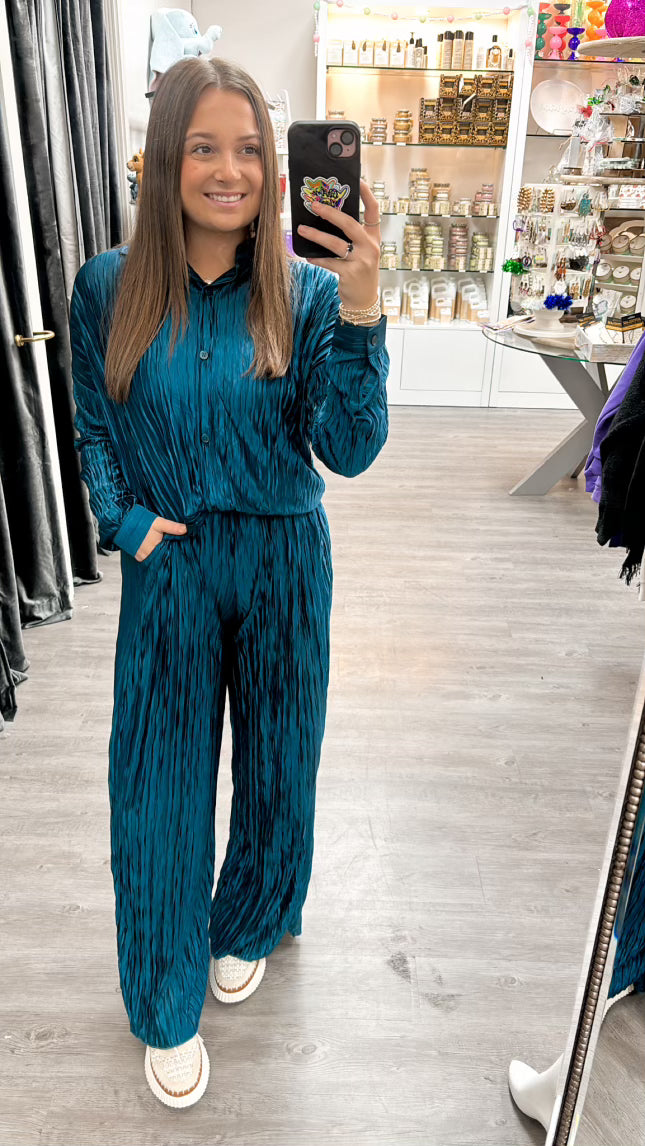 Elastic waistband wide opening long pants. Teal with geo-pleats.