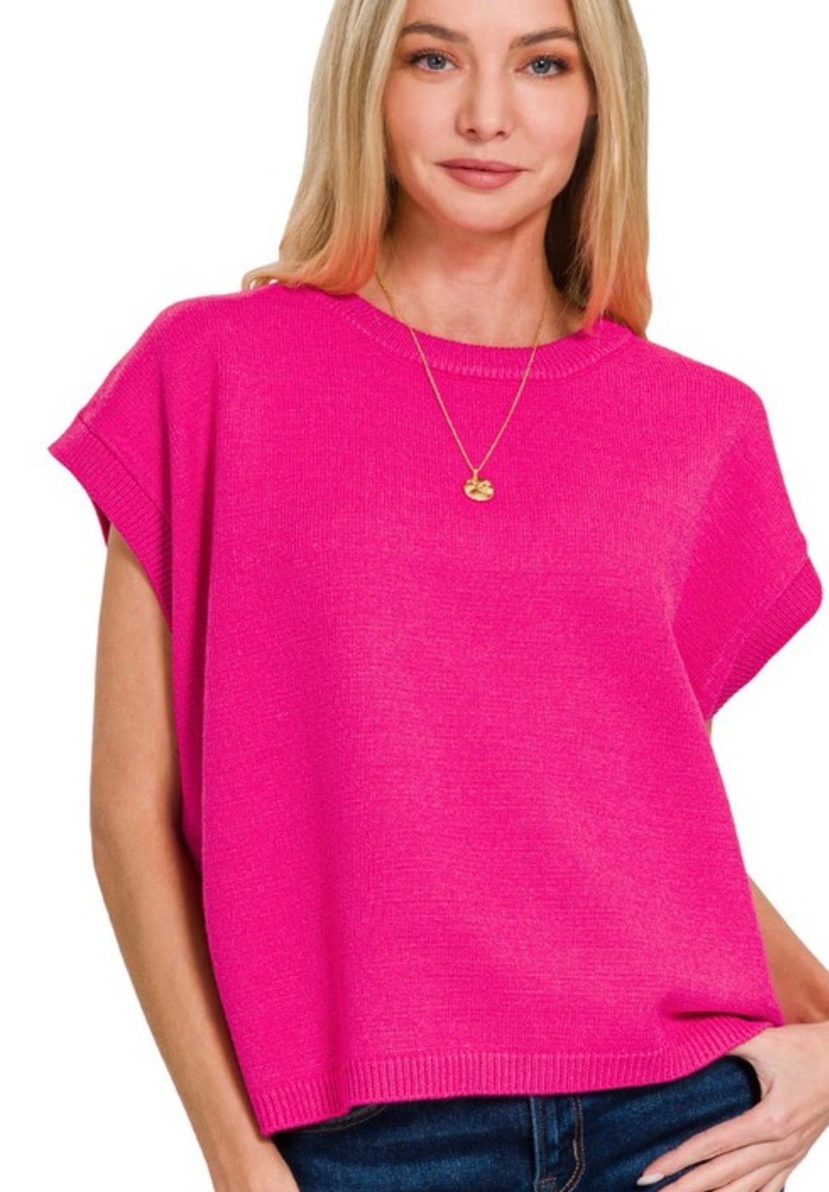 This pink short sleeve sweater is perfect. Style it up or down for any occasion. Perfect for a Valentines dinner or Spanish Town parade.