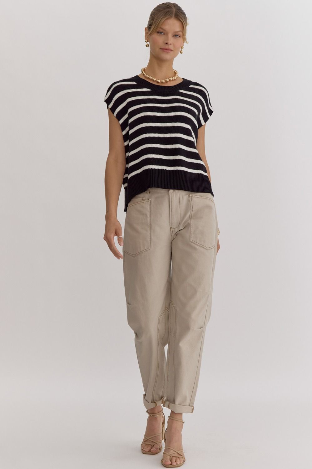 Stripe print round neck short sleeve knit top featuring slit at sides. Unlined. Knit. Non-sheer. Lightweight.