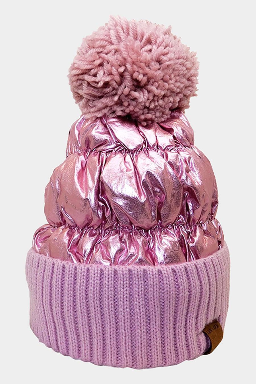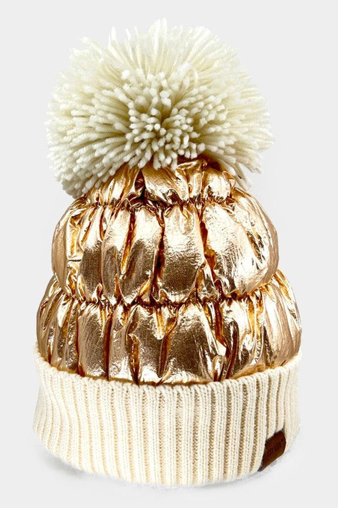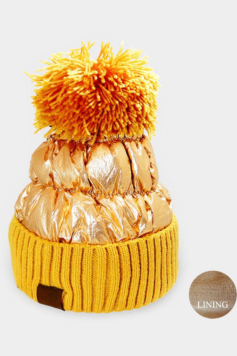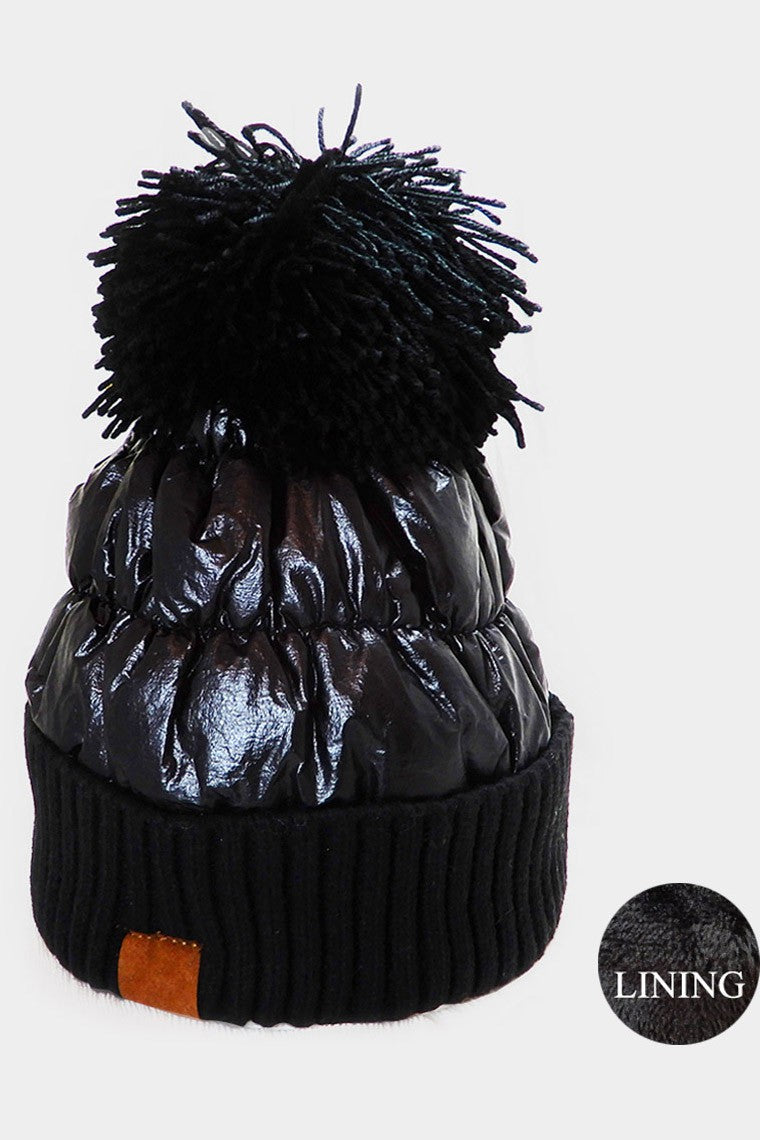 Fleece Lining Puffer Knit Pom Pom Beanie Hat